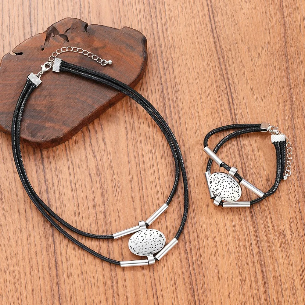 2pcs Set Boho Retro Double-layer Leather Rope Silver Color Oval Pendant Necklace Bracelet for Women Jewelry Sets Accessory Gifts